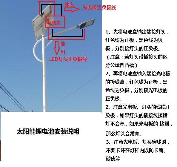 為了更方便客戶能夠使用太陽能路燈,我們保定太陽能路燈生產廠家為客戶提供了正確的安裝接線步驟示意圖。這圖詳細地講解了太陽能鋰電池路燈的使用方法,指導客戶能夠正確的接線。