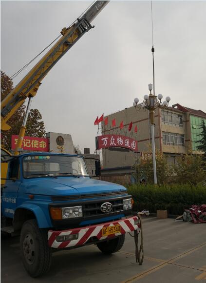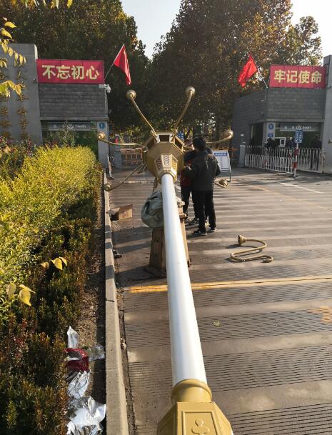 地面工作已經完成開始吊車起吊了,有條不紊的立桿工作開展起來,10米高的中華燈就穩穩的豎立在大門口了。晚上保定太陽能路燈廠家產品就會照射光亮,方便了單位上下班。